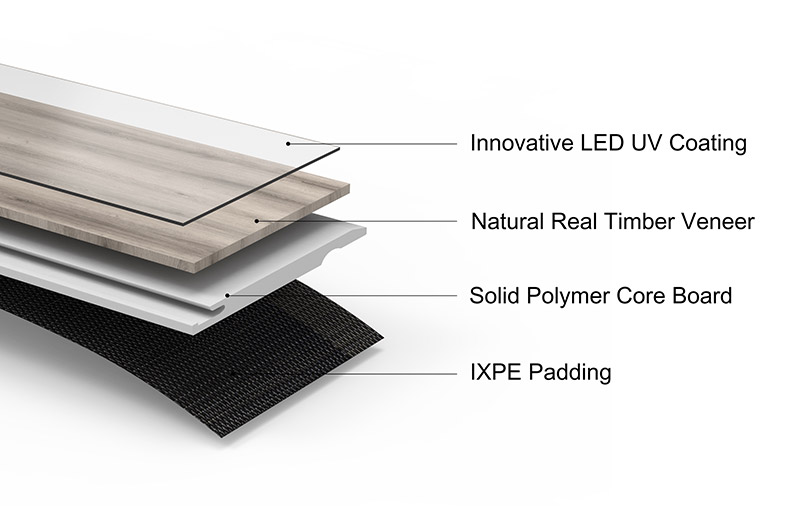 Schichtaufbau: Furnier-SPC-Bodenbeläge bestehen typischerweise aus mehreren Schichten, einschließlich der Holzfurnierschicht, einer PVC-Schicht (mit Kalkstein und Weichmachern), einem SPC-Kern und einer Unterlage. Diese geschichtete Konstruktion sorgt für ein ausgewogenes Verhältnis von Festigkeit, Stabilität und Ästhetik.